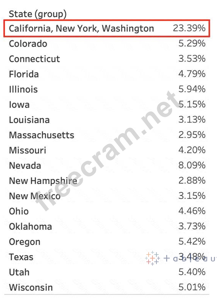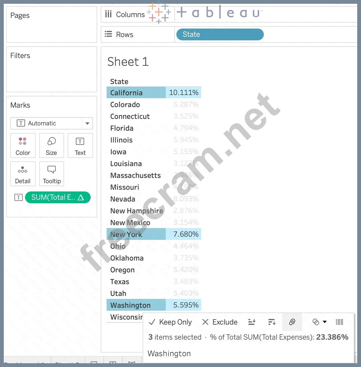 Using the CoffeeChain table, create a crosstab showing the Total Expenses per State and add Column Grand Totals to the view. Now group the states of New York, California and Washington. What percent of the total sales does this group contribute?