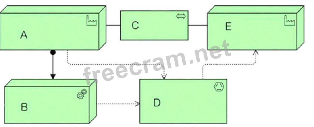 The diagram uses the ArchiMate notation for physical elements, which are used to model physical concepts like machines, physical installations, materials, and distribution networks. A is an equipment element, which represents a physical machine, tool, or instrument that can create, use, store, move, or transform materials. B is a material element, which represents tangible physical matter or energy. C is a distribution network element, which represents a physical network used to transport materials or energy. References: ArchiMate Physical elements1; ArchiMate 3.2 Specification, Chapter 9: Physical Elements2; Introduction to ArchiMate 3.0 (Part 4 Physical Elements)3.