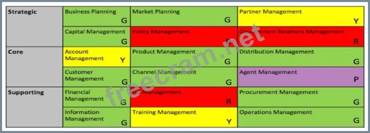 Consider the following business capability map. where cells of a model are given different colors to represent desired maturity levels (Green (G) = level achieved, yellow (Y) = one level away, red (R) =two or more levels away, purple (P) = missing capability):