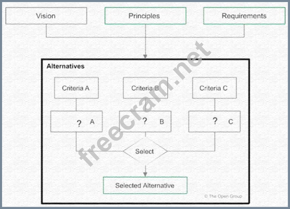 The graphic illustrates a method for developing alternative target architectures in Phase E of the TOGAF ADM1. The method involves identifying and evaluating candidate architectures based on criteria such as business value, cost, risk, and feasibility1. The method helps to identify the most suitable architecture solution for the enterprise. The graphic illustrates a method that supports the TOGAF ADM by identifying and evaluating alternative target architectures. The process begins with a vision, influenced by principles and requirements, leading to the consideration of alternatives. Each alternative is assessed based on different criteria, leading to the selection of the most suitable target architecture. This is consistent with the TOGAF approach of developing a set of potential architectures and then selecting the one that best meets the enterprise's needs.