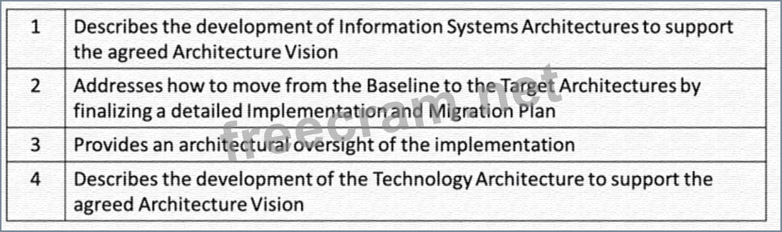 The ADM Phases that match the purpose descriptions provided are: Phase C for the development of Information Systems Architectures to support the agreed Architecture Vision, Phase F for addressing the move from the Baseline to the Target Architectures by finalizing a detailed Implementation and Migration Plan, Phase G for providing architectural oversight of the implementation, and Phase D for describing the development of the Technology Architecture to support the agreed Architecture Vision.