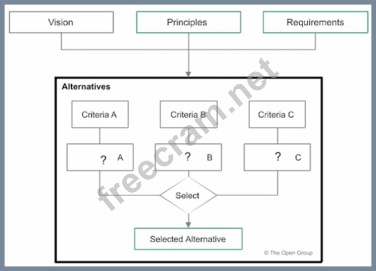 The graphic illustrates a method for developing alternative target architectures in Phase E of the TOGAF ADM1. The method involves identifying and evaluating candidate architectures based on criteria such as business value, cost, risk, and feasibility1. The method helps to identify the most suitable architecture solution for the enterprise. https://pubs.opengroup.org/togaf-standard/adm-techniques/chap10.html The graphic illustrates a method that supports the TOGAF ADM by identifying and evaluating alternative target architectures. The process begins with a vision, influenced by principles and requirements, leading to the consideration of alternatives. Each alternative is assessed based on different criteria, leading to the selection of the most suitable target architecture. This is consistent with the TOGAF approach of developing a set of potential architectures and then selecting the one that best meets the enterprise's needs.