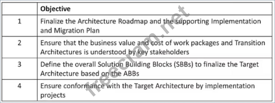 1E: To identify delivery vehicles (projects programs portfolios) that will deliver the Target Architecture 2F: To confirm readiness and ability to undergo change 3E: To determine whether an incremental approach is required and if so identify Transition Architectures that will deliver continuous business value 4G: To perform appropriate governance functions while the solution is being implemented