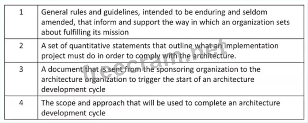 Consider the following descriptions of deliverables consumed and produced across the TOGAF ADM cycle. Which deliverables match these descriptions?