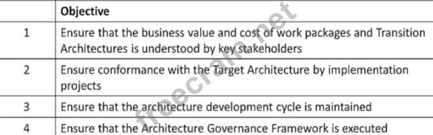 * Objective 1: Ensure that the business value and cost of work packages and transition architectures is understood by key stakeholders. This objective is achieved in Phase H: Architecture Change Management, where the value realization and cost-benefit analysis of the architecture are performed2.