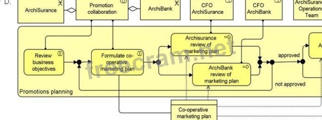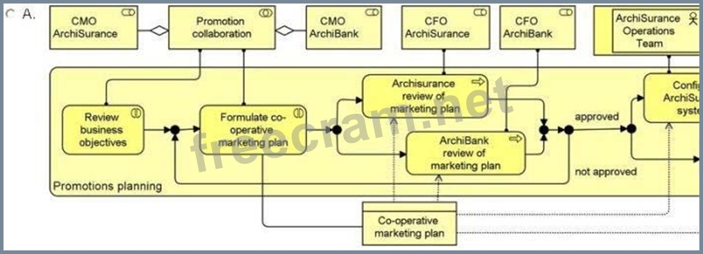 ArchiSurance has a partnership with ArchiBank in which the two companies market each other's consumer offerings to their own customers. Each quarter, the chief marketing officers (CMOs) of the two companies work together to plan the next quarter's promotions. First, they review each other's business objectives related to the partnership. Then, they formulate the co-operative marketing plan. The CMOs determine which offerings they will promote, the characteristics of the target customers, and the timing of each promotion. They assemble their findings into a co-operative marketing plan that is reviewed separately by the chief financial officer (CFO) of each organization. If either of the CFOs finds a problem, the CMOs must quickly work together to formulate another version of the plan. The review and reformulation process continues until both CFOs have approved a version of the plan. Then, the CMOs share the plans with their respective operations teams. Each organization's operations team configures the bank's systems to execute the joint promotions.
