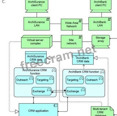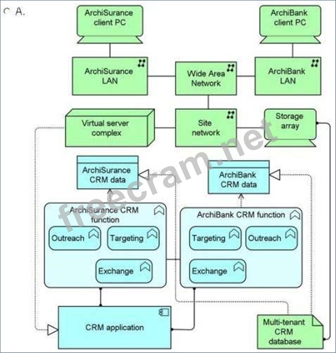 The multi-tenant CRM application component is hosted on a large virtual server complex that is connected via a site network to a physical storage array and a commercial wide-area network (WAN) used by both companies. Both companies access their CRM systems via PCs connected to Local Area Networks (LANs) that are in turn connected to the shared commercial WAN.