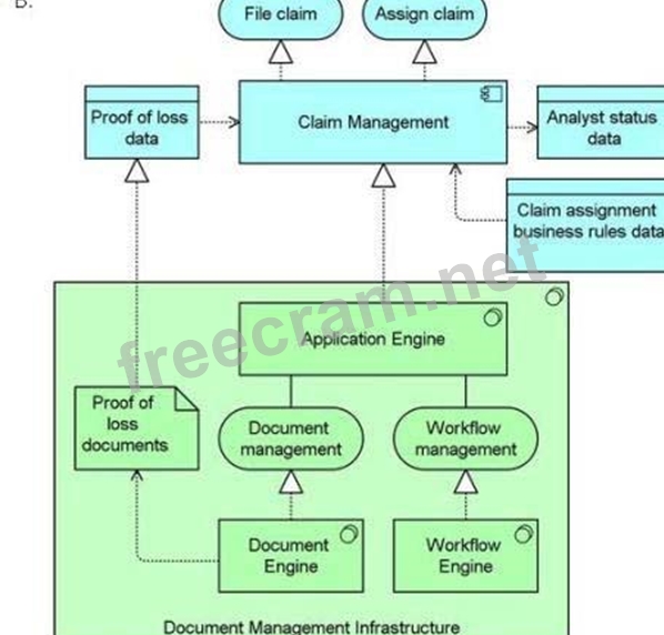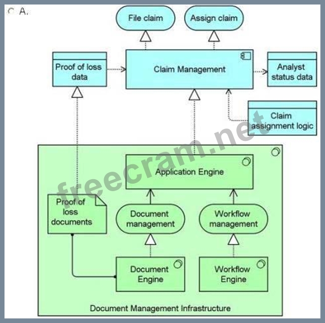 The claim management application component is critical to ArchiSurance business operations. It is hosted by the application engine, and launches whenever an individual files a new claim. The claim management component requires different documents to demonstrate proof of loss depending on the type of claim filed, the type of insurance that is in force, and various other circumstances. When the correct documents are filed and verified by an intake operator, proof of loss is complete, and the claim management component assigns the claim to a claim analyst by reading and updating analyst status data and applying business rules stored as data.