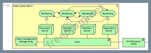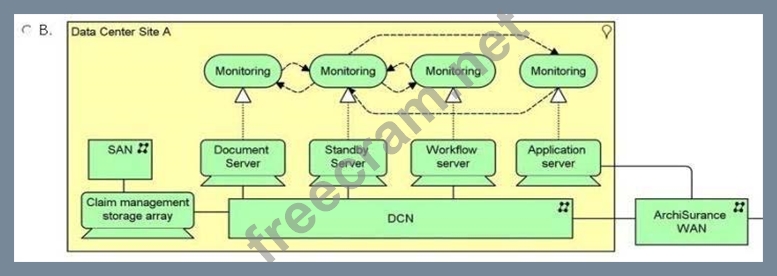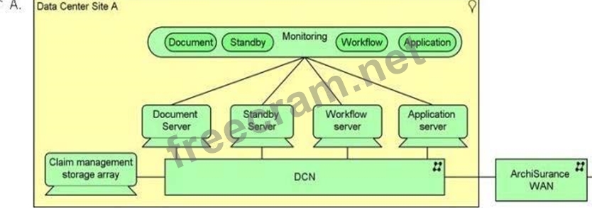 Both sites provide identical infrastructure. Each site contains a highly available data center network (DCN) that is connected to the highly available ArchiSurance wide area network (WAN). Each claim management server is connected to its site DCN, and each DCN is a converged network that connects both servers and storage arrays, including a physical storage array dedicated to the claim management application. Each site contains four high-powered separate physical servers dedicated to the claim management application. At any one time, one server is on standby while the other three servers are, respectively, hosting the document, workflow and application engines. Each active server provides a monitoring service that is In constant two-way communication with the monitoring service on the standby server. If a server fails, the surviving monitoring services perform a failover sequence to assume failed server's workload if it was active. The surviving monitoring services also alert the operations team on duty.