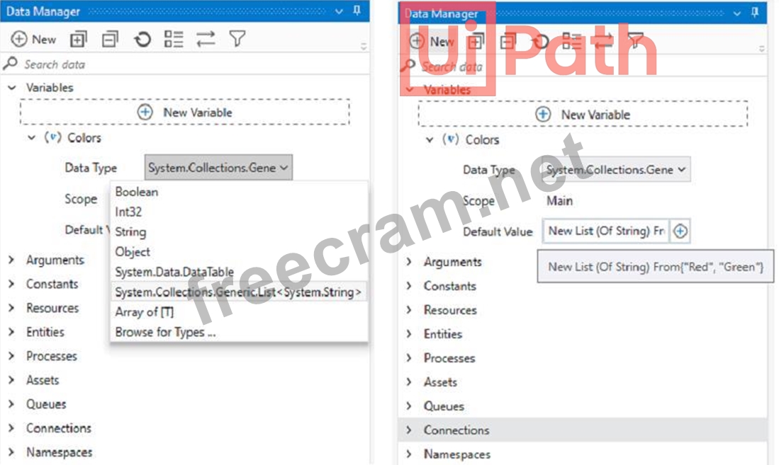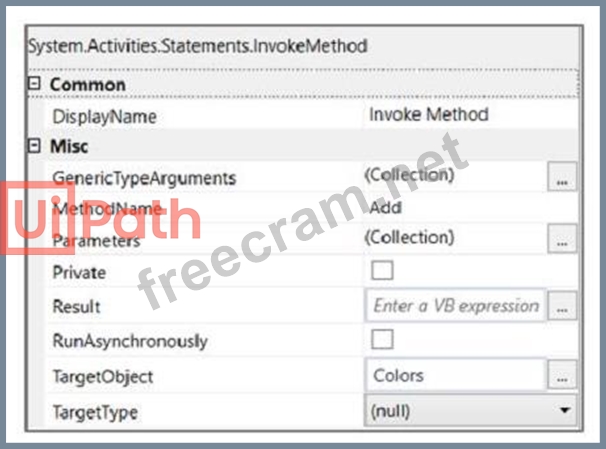 Explanation The Invoke Method activity is used to execute a method of a class or an object1. In this case, the developer wants to add items to a list of strings using the Add method of the List class2. The list is declared as Colors and initialized with two items: "Red" and "Green". The Invoke Method activity has the following properties: TargetObject: Colors (the list variable) MethodName: Add (the method of the List class) Parameters: Direction - In, Type - String, Value - "Yellow" (the item to be added to the list) Based on these properties, the Invoke Method activity will add the string "Yellow" to the end of the Colors list. Therefore, the outcome of this Invoke Method activity is that Colors will contain items in the following order: "Red", "Green", "Yellow". Option A is incorrect because the Invoke Method activity will not throw an error, as the properties are configured correctly. Option B is incorrect because the order of the items in the list will not change, as the Add method appends the item to the end of the list. Option D is incorrect because the list will have three items, not two, as the Add method does not overwrite any existing item. References: Invoke Method activity documentation from UiPath List<T>.Add(T) Method documentation from Microsoft