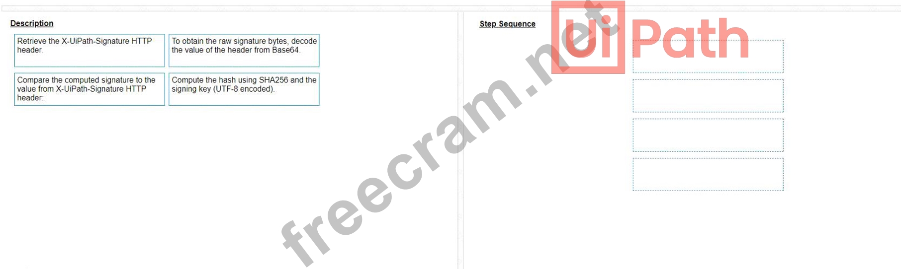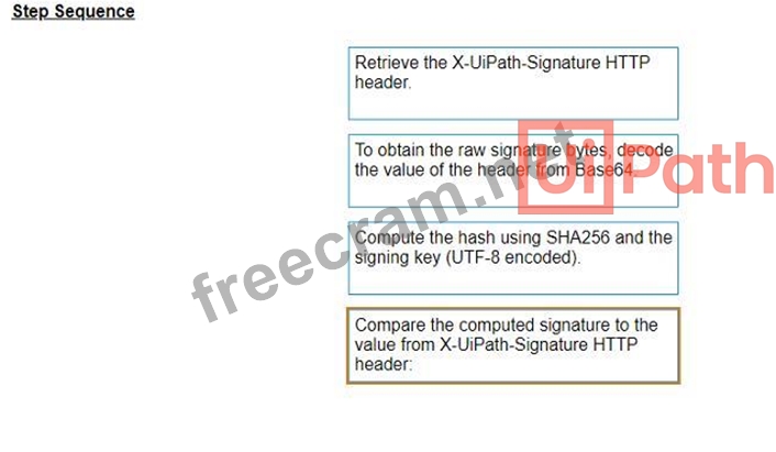 Retrieve the X-UiPath-Signature HTTP header. This header contains the signature of the request body, encoded in Base64. (UiPath Orchestrator documentation1) To obtain the raw signature bytes, decode the value of the header from Base64. You can use any tool or library that supports Base64 decoding. (UiPath Orchestrator documentation1) Compute the hash using SHA256 and the signing key (UTF-8 encoded). The signing key is a secret value that is shared between Orchestrator and the client app. You can use any tool or library that supports SHA256 hashing. (UiPath Orchestrator documentation1) Compare the computed signature to the value from X-UiPath-Signature HTTP header. If they match, then the request is authentic and has not been tampered with. If they do not match, then the request is invalid and should be rejected. (UiPath Orchestrator documentation1) References: