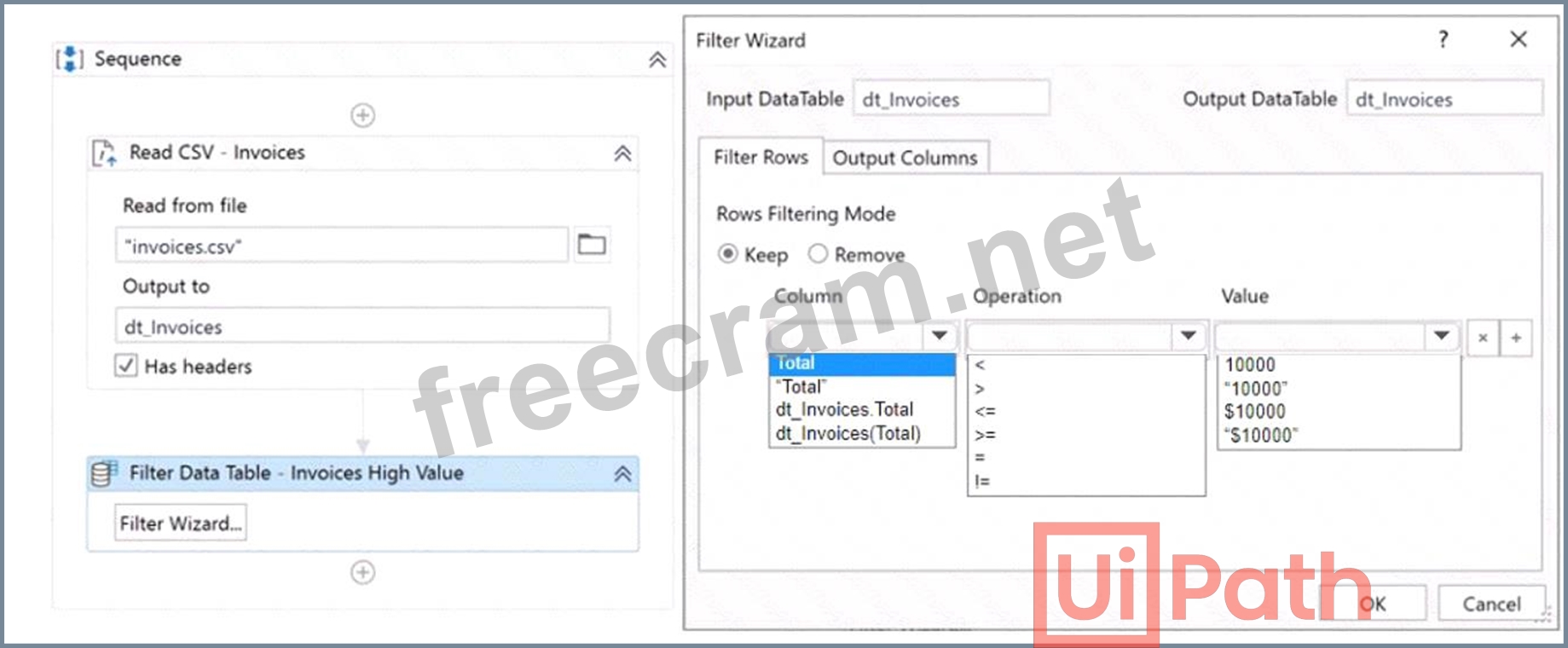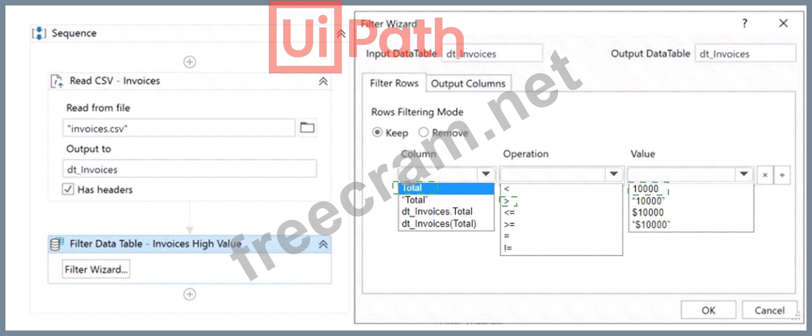 Instructions: Using the drop-down lists shown in the following exhibit, configure the Filter Data Table Wizard to keep all invoices with a Total value that is over 10 000 USD.