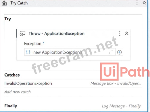 The Try section contains the activities that may throw an exception or an error. If an exception or an error occurs, the execution of the Try section is stopped and the control is passed to the Catches section1.