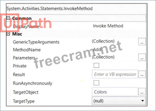 A developer wants to add items to a list of strings using the Invoke Method activity. The list is declared as follows: The Invoke Method includes the following properties: The Invoke Method includes the following properties: Based on the exhibits, what is the outcome of this Invoke Method activity?