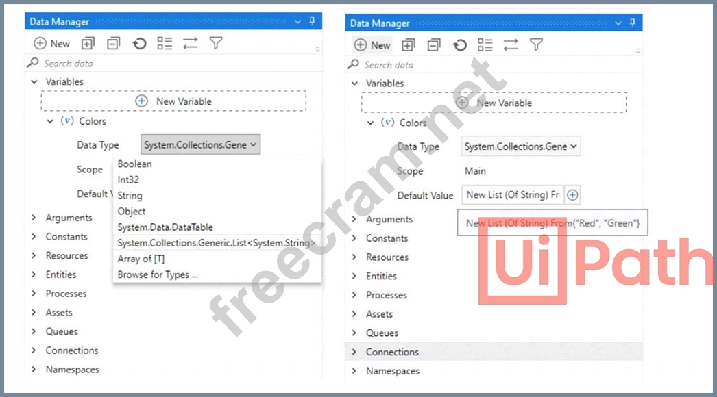 Based on the exhibits provided, the developer has set up an Invoke Method activity to add an item to the "Colors" list variable. The list is initially declared with two items "Red" and "Green". The Invoke Method activity is configured to add the string "Yellow" to this list. The properties of the Invoke Method activity indicate that the method 'Add' will be called on the target object 'Colors' with the parameter "Yellow". This means the string "Yellow" will be added to the end of the list. The outcome of executing this Invoke Method activity will be: D: Colors will contain items in the following order: "Red", "Green", "Yellow". This is because items in a List<T> in .NET are added in sequence, and the "Add" method appends the new item to the end of the list.