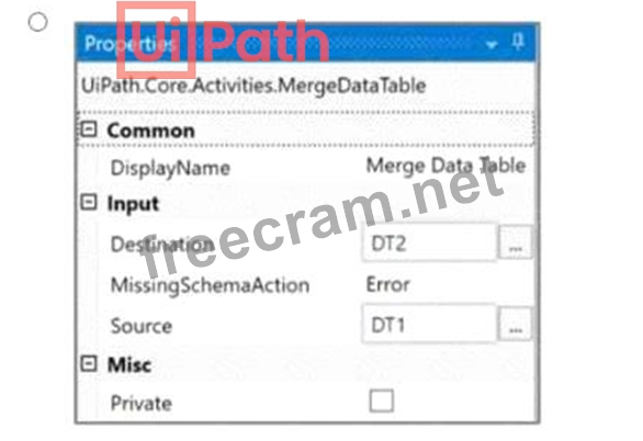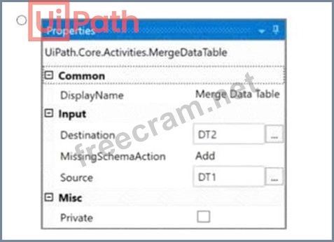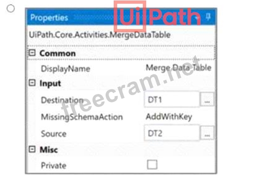 Option A shows the correct configuration for the Merge Data Table activity to achieve this result: