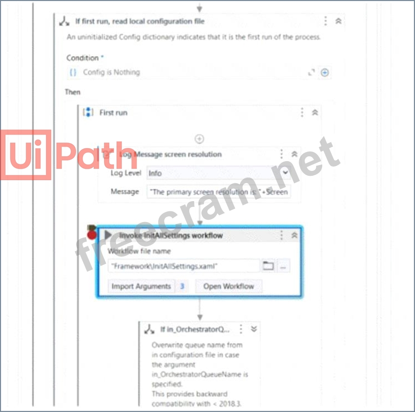 When a breakpoint is placed at a particular activity within the workflow and the Step Over function is used, the Executor will move to the next activity in the sequence. Given the context of the REFramework, after stepping over the "Invoke InitAllSettings" workflow, the next activity that would execute is the "If in_OrchestratorQueueName ..." activity, assuming there are no activities in between within the "InitAllSettings" workflow itself. Step Over will not go into the invoked workflow but will move to the next activity at the same level of the workflow where the breakpoint was placed. References: UiPath Studio Guide: Debugging