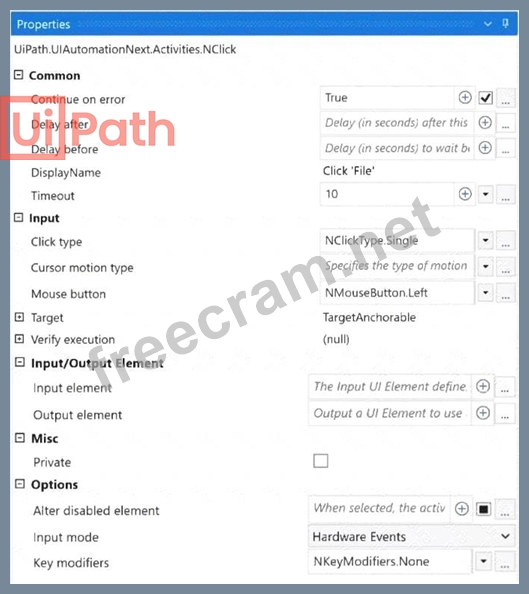 The Click activity has a property called TimeoutMS. This property specifies the amount of time (in milliseconds) to wait for the activity to be executed before an error is thrown. In this case, the TimeoutMS property is set to 10000 milliseconds (10 seconds). Therefore, if the activity cannot find its target at runtime, an exception will be thrown after 10 seconds.