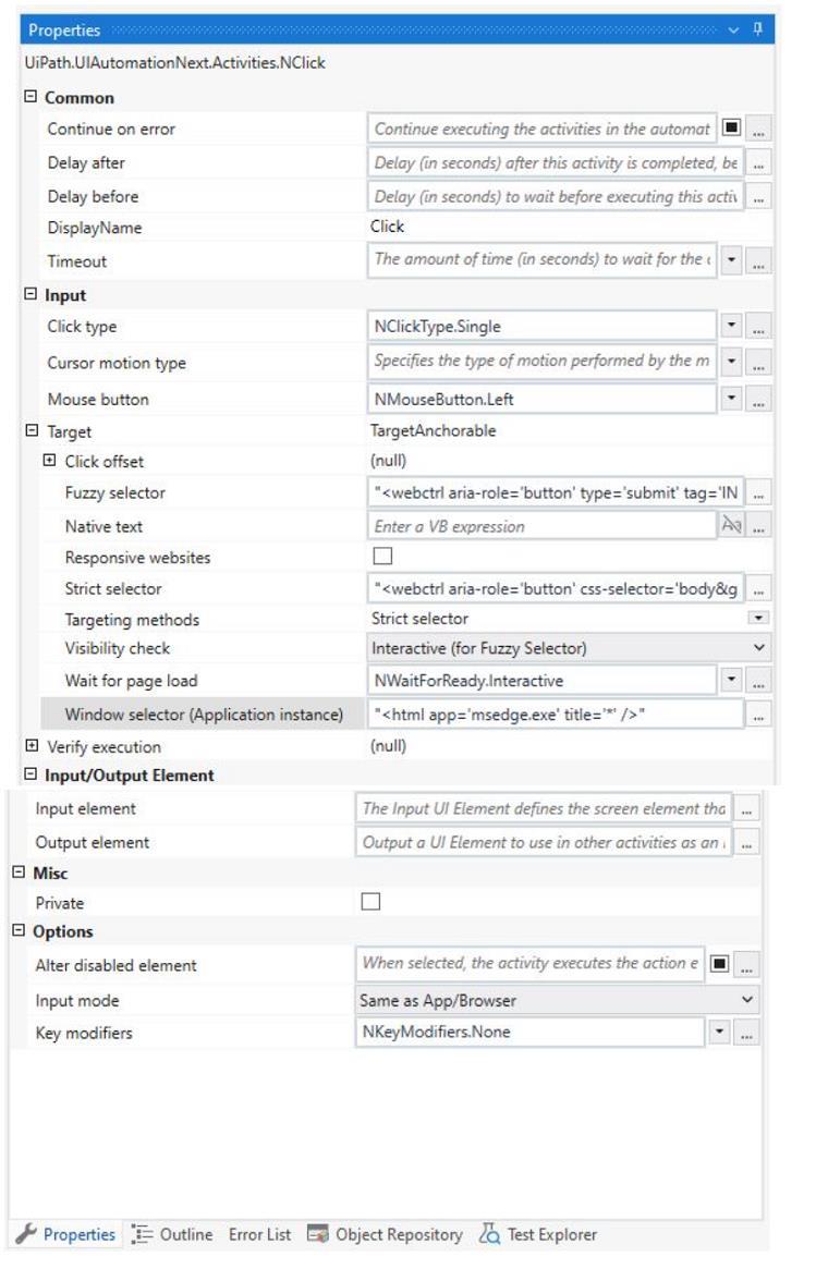Click activity has the following properties: *ClickType: Single *MouseButton: Left *Target.Timeout: 30000 ms (30 seconds) *Target.WaitForReady: Interactive The Target.Timeout property specifies the amount of time (in milliseconds) to wait for the activity to run before the SelectorNotFoundException error is thrown1. The default value is 30000 milliseconds (30 seconds) 2. The Target.WaitForReady property determines how long the activity should wait for the target UI element to be ready before performing the action1. The following options are available: *None: Does not wait for anything except the target UI element to exist before executing the action1. *Interactive: Waits until only a part of the app is loaded1. *Complete: Waits for the entire app to be loaded1. The default value is Interactive2, which means that the activity will wait until the UI element is visible and can be interacted with3. Therefore, based on these properties, the Click activity will wait for the element indicated by the selector to be loaded and clickable within 30 seconds. If the element is loaded before the timeout, the activity will click it and continue to the next activity. If the element is not loaded within the timeout, the activity will throw an error and stop the execution. The animation on the web page does not affect the Click activity, as long as the target element is loaded and visible. Hence, the correct answer is A. Element is clicked once the element is fully loaded.