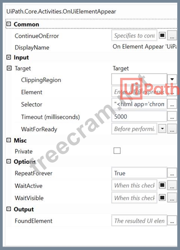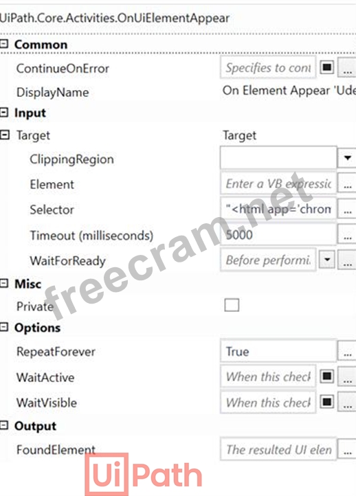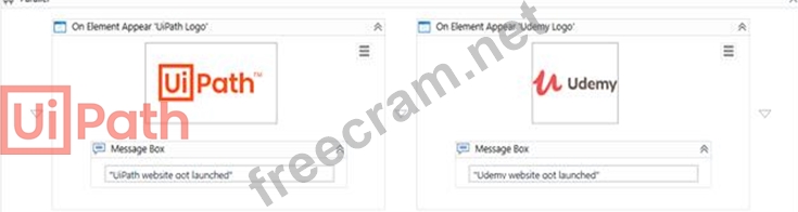 As both activities have the same Timeout, the outcome of both will be executed. So first, Message Box "Udemy website got launched", as the website was launched in 4 seconds, and Timeout is 5 seconds. Then an error is thrown by On Element Appear 'UiPath Logo', as the website was not launched in 5 seconds. UiPath Forum Exam Topic: Describe the use of various Classic UI synchronization activities; for example, ElementExists, FindElement, and FindText