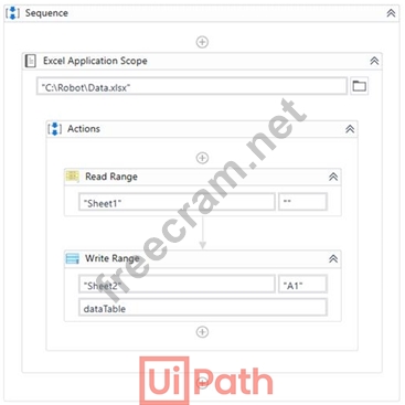 A developer uses Read Range and Write Range activities to copy data from one worksheet to another. What will be the value of "A1" cell in "Sheet2" worksheet when the following sequence is executed?