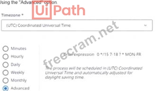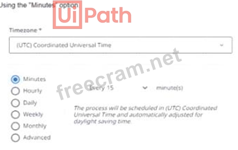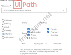 "Daily" option, which will run the process once a day at 15 minutes past 7 AM, not every 15 minutes. Option C uses the "Weekly" option, which will run the process once a week on Monday at 15 minutes past 7 AM, not every 15 minutes. References: UiPath Automation Solution Architect Learning Plan, Module 5: