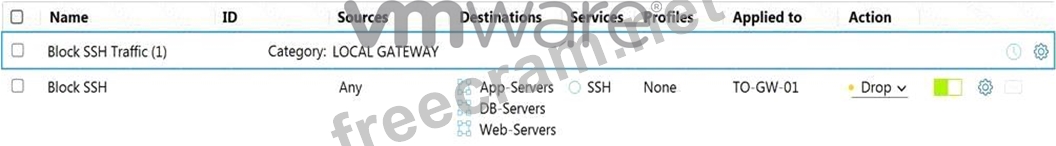 The firewall rule shown in the exhibit is part of a gateway firewall applied to a Tier-0 gateway (TO-GW-01). The key indicators are the "Category: LOCAL GATEWAY" and the "Applied to: TO-GW-01". The rule is set to "Drop" SSH traffic (port 22) from any source to the destinations listed (App-Servers, DB-Servers, Web-Servers). References: * VMware NSX-T Data Center Documentation * Understanding Firewall Categories in NSX-T