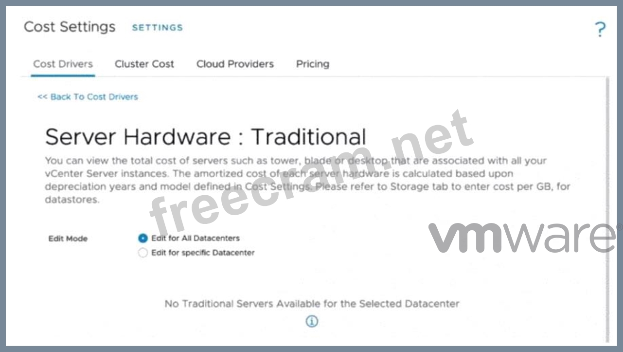 The message "No Traditional Servers Available for the Selected Datacenter" indicates that all the hosts in the selected datacenter are part of vSAN-enabled clusters. In VMware vRealize Operations, traditional cost drivers apply only to server hardware that is not managed within a vSAN environment. When vSAN is enabled on clusters, the cost drivers and cost calculations for hardware are managed differently because vSAN considers storage costs as part of the software-defined infrastructure, which changes the way costs are modeled and amortized. Key Points: * Traditional Hardware vs. vSAN: * Traditional cost drivers are associated with non-vSAN environments (e.g., standard storage and compute hardware costs). * For vSAN-enabled clusters, cost calculations must include software-defined storage and are therefore managed under different settings. * Message Meaning: * The error clearly indicates that there are no traditional servers detected because all hosts are part of vSAN-enabled clusters in the datacenter. * Resolution: * If the administrator wants to update cost drivers for these clusters, they must refer to vSAN- specific cost models in vRealize Operations. * Navigate to the vSAN cost settings section in the interface to input appropriate cost metrics.