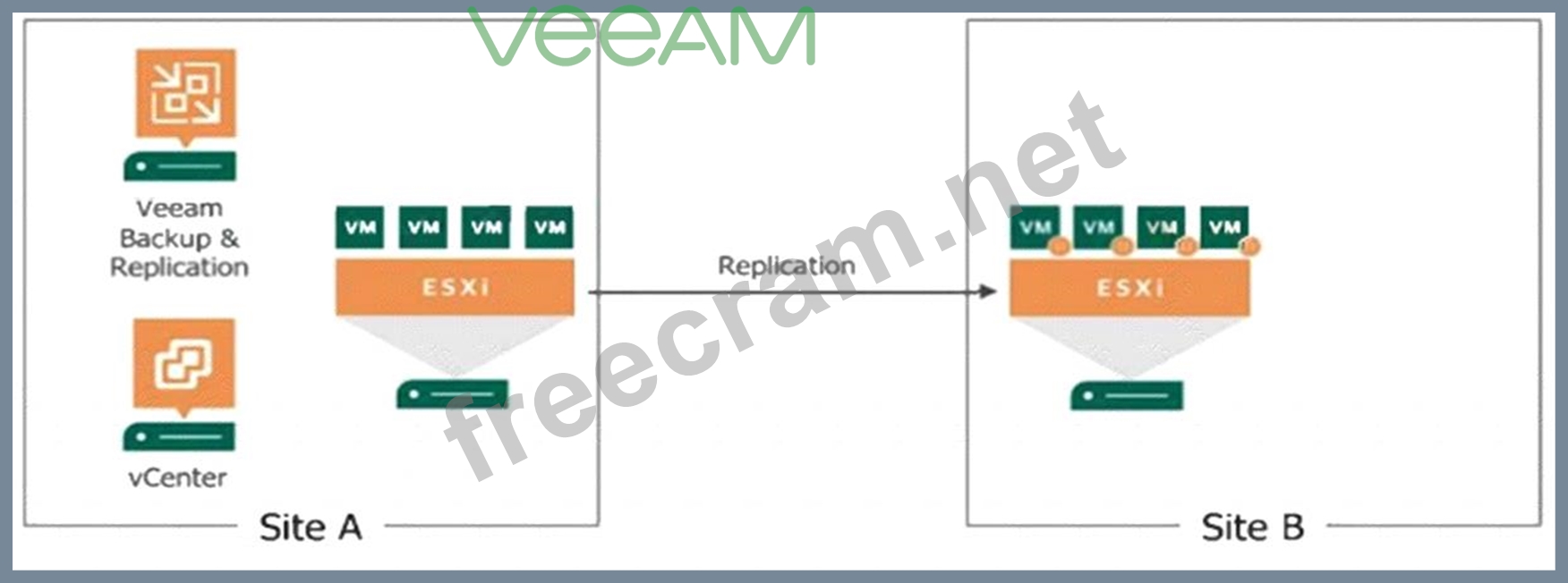 A power outage on Site A is expected during the night. The disaster recovery strategy has been implemented (see diagram). What is the correct way to start replicated VMs on Site B to minimize data loss?