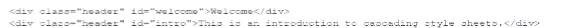 To apply CSS only to the first line of a particular HTML element, the ID selector #Welcome should be used as per the given HTML structure. * CSS ID Selector: The ID selector is used to style the element with a specific id. * Usage Example: #Welcome { color: red; } In this example, the #Welcome selector will apply the red color style only to the element with id="Welcome". References: * MDN Web Docs on ID Selectors * W3C CSS Specification on Selectors