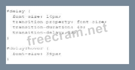 The CSS transition-delay property specifies how long to wait before starting a property transition. In the given CSS code, the transition-delay is set to 2s. * CSS Transition Properties: * transition-property: Specifies the CSS property to which the transition is applied (font-size in this case). * transition-duration: Specifies how long the transition takes (4s). * transition-delay: Specifies the delay before the transition starts (2s). Example: * Given HTML: <div id="delay">Hover over me</div> * Given CSS: #delay { font-size: 14px; transition-property: font-size; transition-duration: 4s; transition-delay: 2s; } #delay:hover { font-size: 36px; } Explanation: When a user hovers over the element with id="delay", it will wait for 2 seconds before the transition effect on font-size starts. References: * MDN Web Docs - transition-delay * W3C CSS Transitions