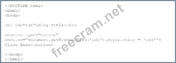 The given code snippet demonstrates how JavaScript can manipulate the DOM to change the style of an element. * Code Analysis: * Given the HTML: <h1 id="id1">Blog Title</h1> <button type="button" onclick="document.getElementById('id1').style.color = 'red'">Click Here</button> * When the button is clicked, the JavaScript code within theonclickattribute changes the color of theh1element to red. * Explanation: * Option A: An event handler tracking keyboard strokes is incorrect because the event handler is tracking a mouse click, not keyboard strokes. * Option B: JavaScript is using the DOM to make a style change is correct because theonclickattribute contains JavaScript code that modifies the style of theh1element. * Option C: In-line CSS is styling the<h1>tag is incorrect because the style change is done via JavaScript, not inline CSS. : MDN Web Docs - Document.getElementById() W3Schools - JavaScript HTML DOM