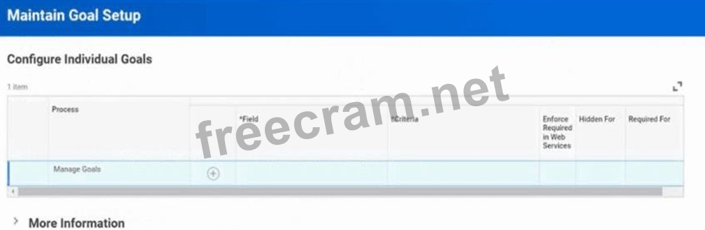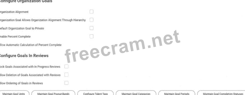 * To make specific goal fieldsmandatory(such as requiring a goal description), you must configure this in theConfigure Individual Goals sectionof theMaintain Goal Setuptask. * In this section, administrators define which fields are: * Required(must be completed by the worker), * Optional, or * Hidden(not shown to users). * TheMaintain Goal Categories taskonly sets up categories such as Innovation, Financial, Productivity. * TheMaintain Goal Units taskconfigures measurement units (e.g., percentages, dollars). * TheConfigure Organization Goals sectiongoverns how enterprise-level organizational goals behave, but does not control whether an individual field like "Description" is required. Therefore, to enforce that workers must always provide a goal description, you configure this requirement in theConfigure Individual Goals section. References: Workday Talent & Performance Admin Guide: "Configure Individual Goals section allows fields such as description, due date, and measurement to be marked as required or optional." Workday Pro Talent & Performance study material confirms:"Goal description requirements are set in Configure Individual Goals, not in organization goal setup or categories."